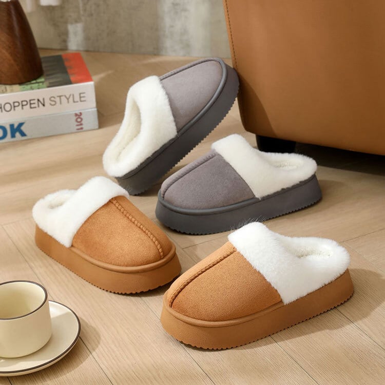 【送料無料】寒い季節に手放せない!ふわふわ裏ボア付きムートン風厚底スリッパ。近所履きにも室内履きにも最適な防寒あったかシューズ。