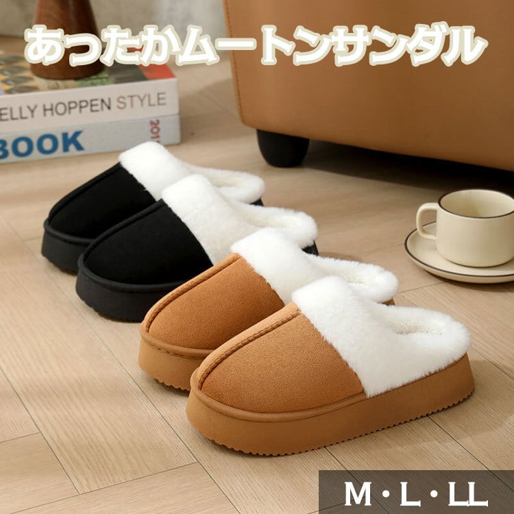 ムートン サンダル レディース スリッパ 厚底 暖かい もこもこ ふわふわ 防寒 シューズ 裏起毛 秋 冬 カジュアル おしゃれ M L LL ブラック グレー キャメル 2980円 送料無料