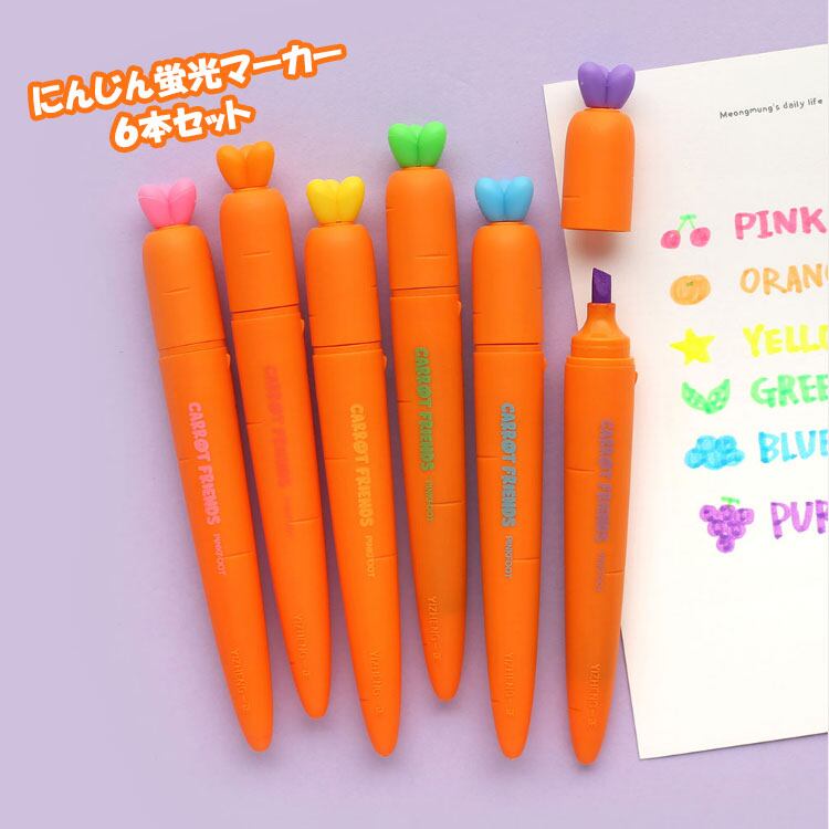 韓国で人気のニンジン型の6色蛍光ペンセット。