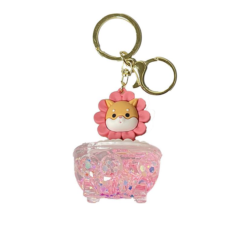 クリアなバスタブの中にカラフルなビーズや飾りが入っていて、その上のアニマルたちはシャンプーハットを着けていてライオンのようになっている、ポップでかわいいキーホルダー♪